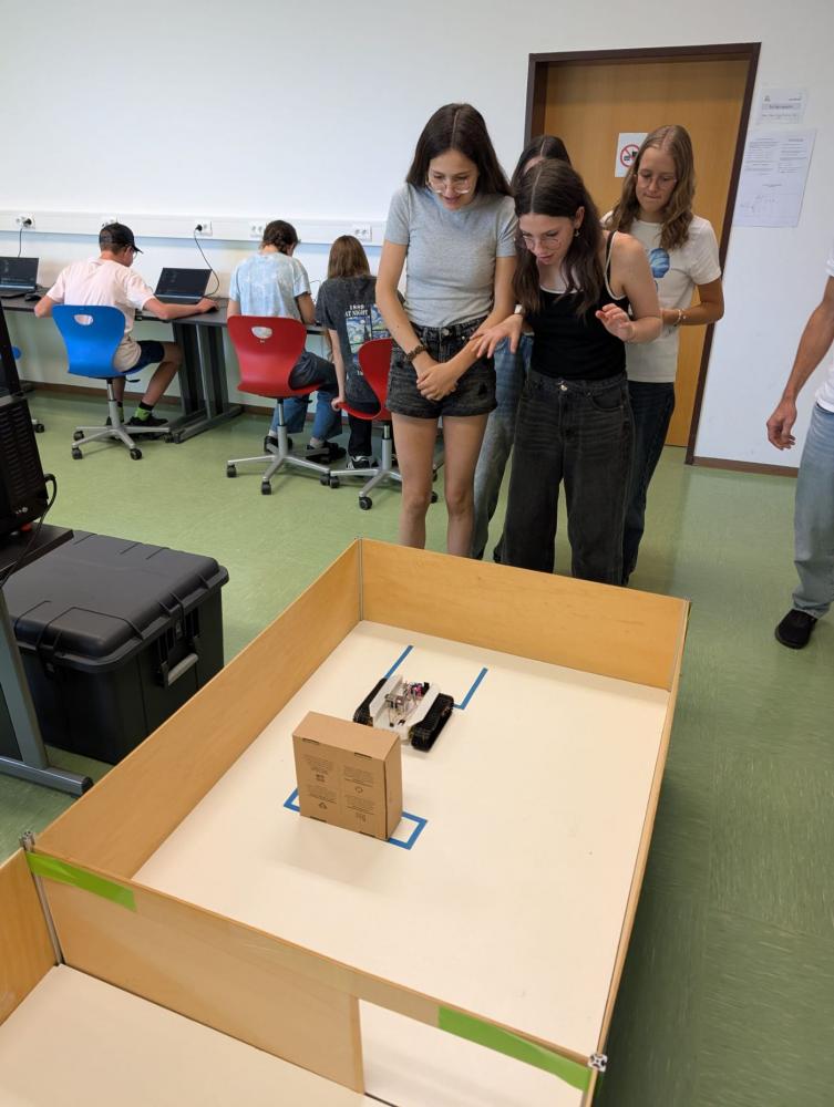 Im Tech-Lab erfuhren wir zuerst einmal wie programmiert wird, um einfache Bewegungsabläufe umzusetzen. Wir konnten einen kleinen Roboter programmieren und dann herausfinden, ob wir die richtigen Befehle eingegeben hatten, den nur so konnte unser Roboter die vorgegebene Strecke ohne Kollisionen bewältigen.
