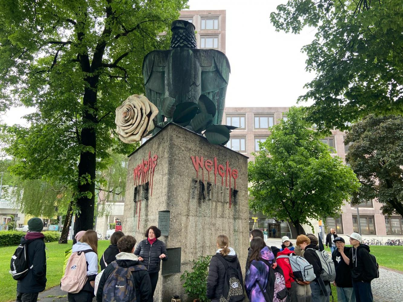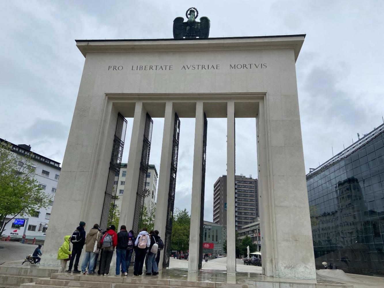 Gegenüber dem ehemaligen Gauhaus, heute Sitz der Tiroler Landesregierung, erfuhren wir interessantes über das Befreiungsdenkmal, das alle alliierten Soldaten, Tirolerinnen und Tiroler, die für die Befreiung vom Nationalsozialismus und für die Wiedererstehung Österreichs ums Leben kamen, ehrt. Außerdem erhielten wir Informationen zur Erinnerung an die Reichskristallnacht im Jahr 1938.