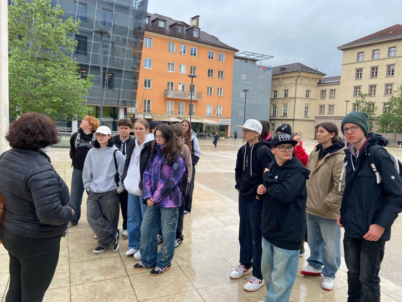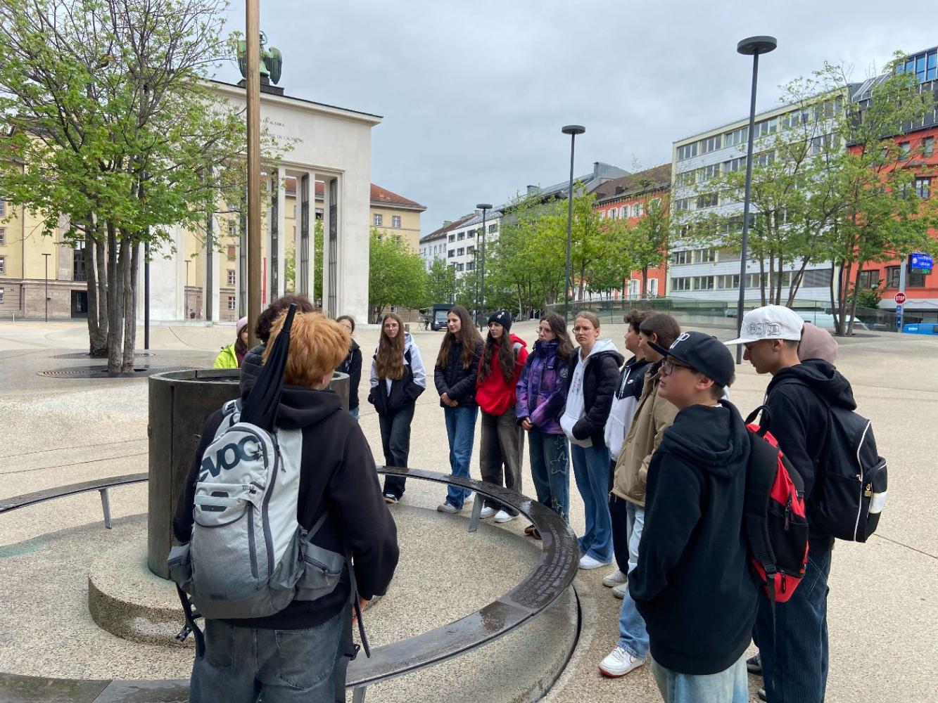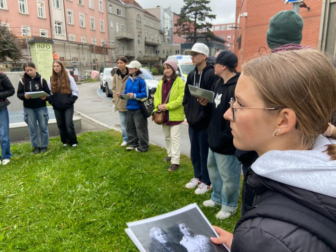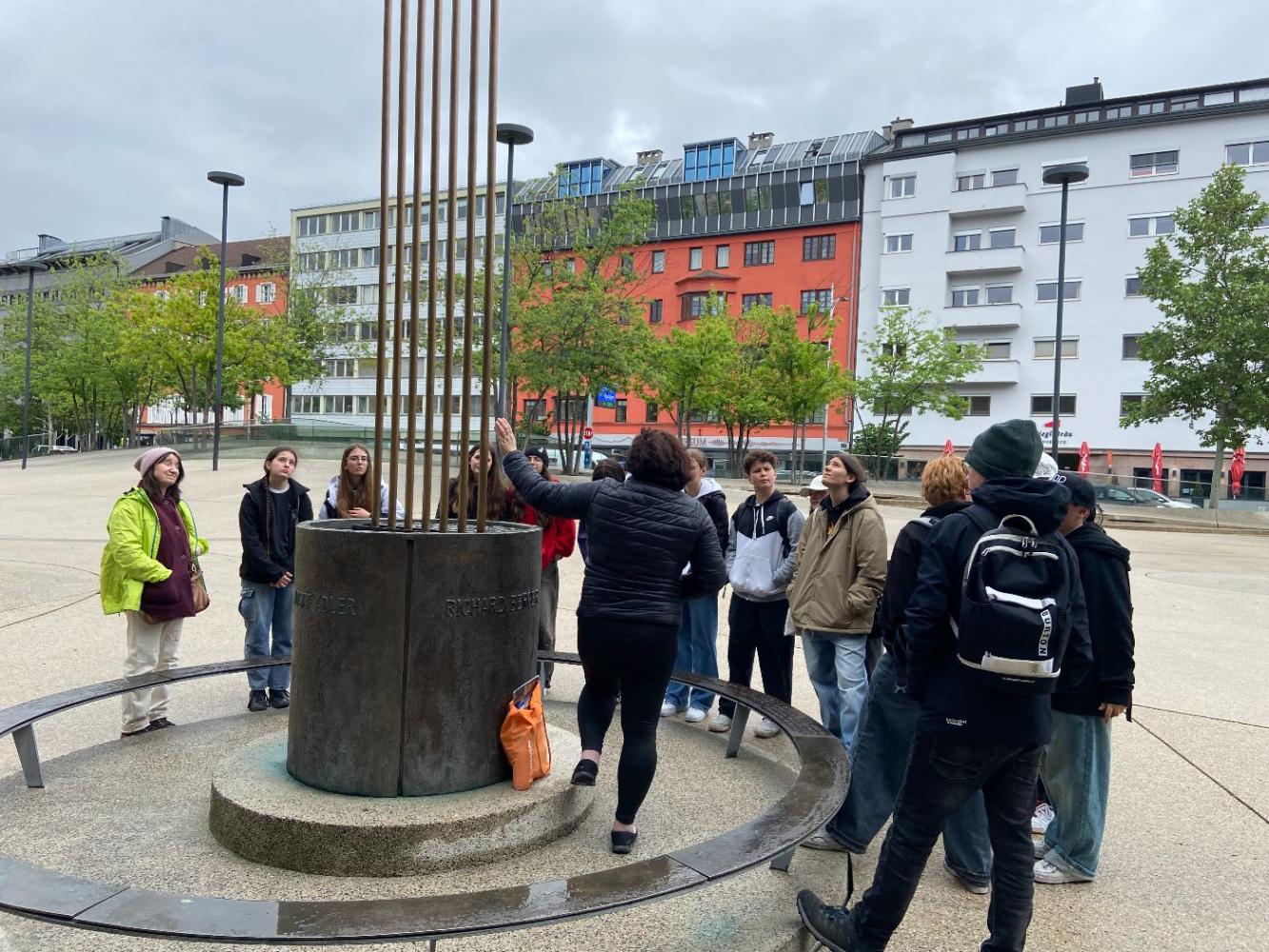 Unser erster Halt war das Denkmal für Christoph Probst, das sich am Gelände der Universität Innsbruck befindet. Christoph Probst war Mitglied der Widerstandsgruppe „Weiße Rose“ und wurde 1943 von den Nationalsozialisten hingerichtet, das Denkmal erinnert an seinen Mut und seinen Einsatz für Freiheit und Menschlichkeit. Vor Ort sprachen wir über seine Rolle im Widerstand, seine Beweggründe und die Bedeutung seines Handelns für die heutige Zeit. Danach besuchten wir das Denkmal am Klinikgebäude, das an alle Opfer der Euthanasie erinnern soll. Ein weiterer Punkt auf unserem Rundgang war das Kaufhaus Tirol, das vor dem Anschluss Österreichs an Hitlerdeutschland, einer jüdischen Familie gehörte. Wir waren sehr erstaunt über die Erinnerungstafel an die jüdische Familien Bauer und Schwarz, ohne unsere Betreuerin hätten wir sie wahrscheinlich gar nicht entdeckt.