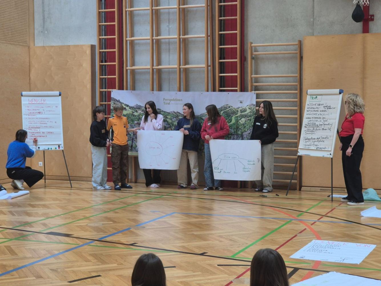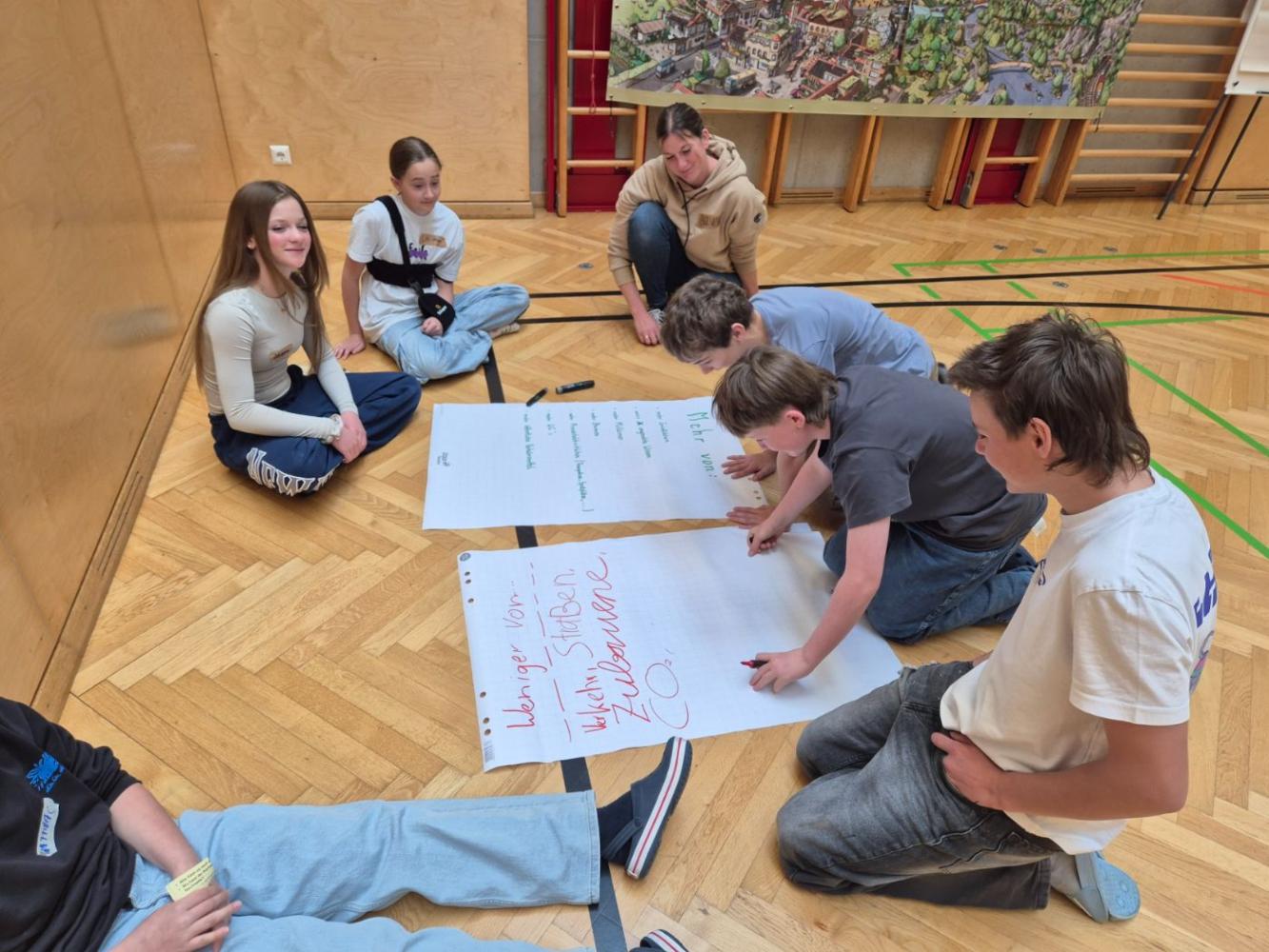 In Gruppen durften die Schülerinnen und Schüler schließlich selbst bestimmen, wovon wir ihrer Meinung nach mehr brauchen und worauf wir im Sinne des Klimaschutzes und der Klimagerechtigkeit verzichten sollten. Die Vorschläge der Kinder werden nun von den Profis des Ateliers für Zeitreisen bearbeitet, um eine konkrete Idee zu entwickeln.