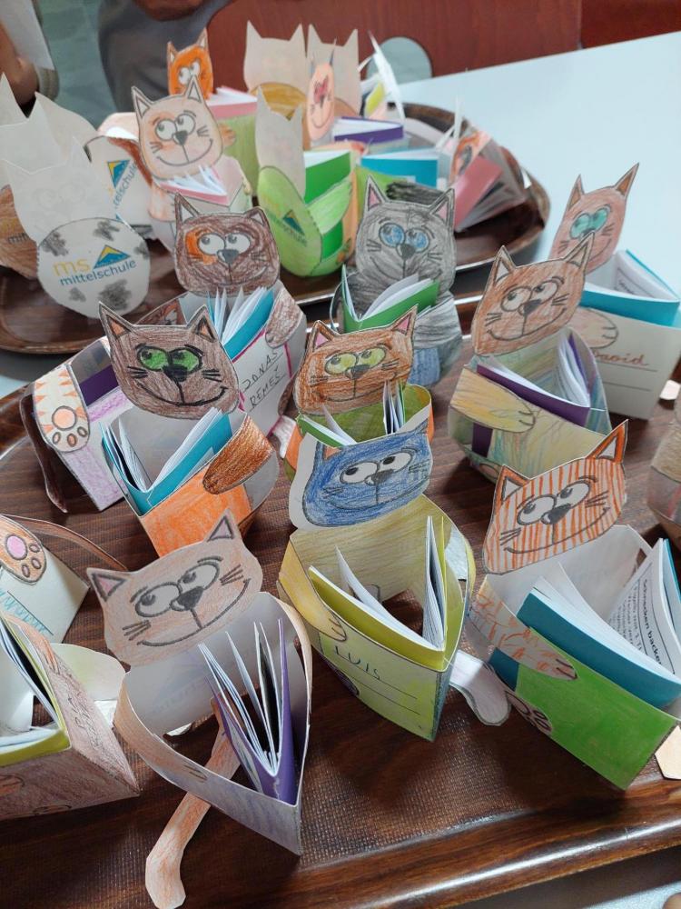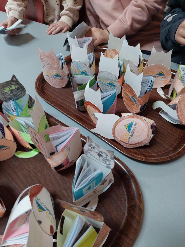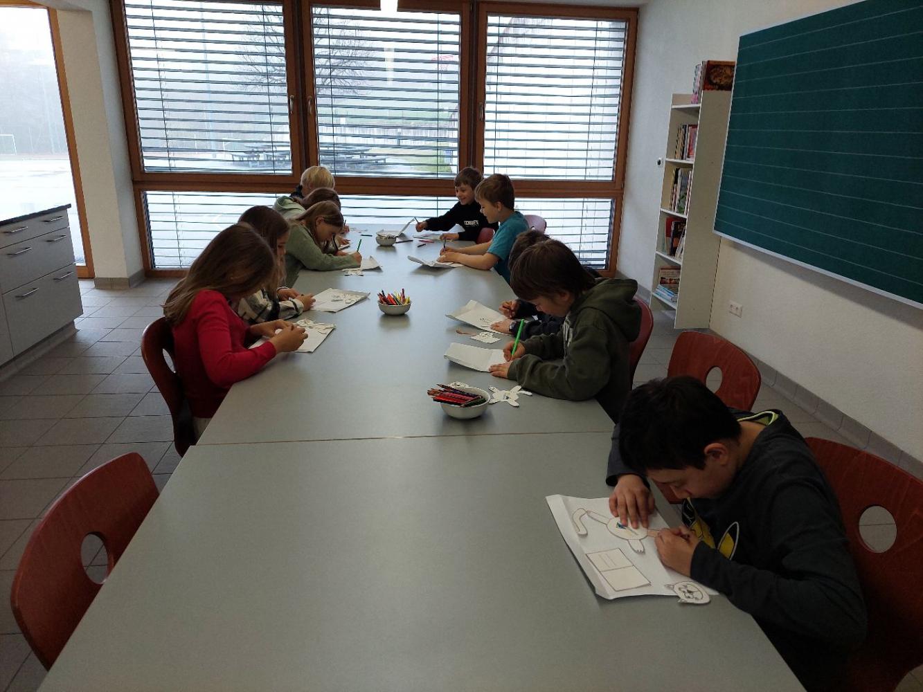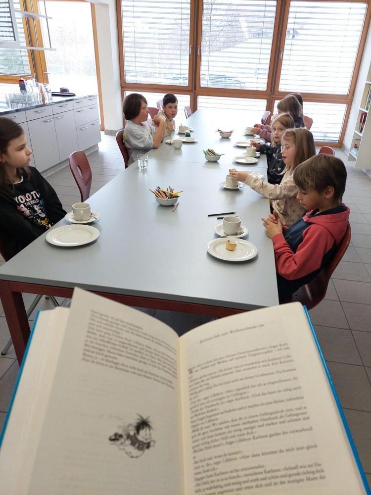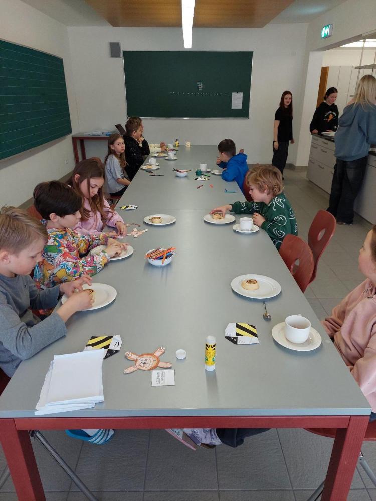 In der Lehrküche warteten Papierkatzen darauf, von den Kindern angemalt und zusammengeklebt zu werden. Diese Katze sollte dann ein Buch halten, das nicht nur die Bücher der Stationen festhielt, sondern auch ein leckeres Rezept enthielt. Doch was wäre eine Lehrküche ohne Schlemmereien? So durften die Kinder hier einen warmen Kakao und eine Zimtschnecke genießen. Dabei hörten sie die Geschichte von "Karlsson vom Dach" von Astrid Lindgren, wie Karlsson mit Lillebror Kakao und Zimtwecken gegessen hat, wie es dazu kam und welche Streiche dazu nötig waren. Die Schülerinnen Lisa, Madlen und Lilli-Marie aus der 3. Klasse und Emma, Johanna, Lena und Sofia aus der 4. Klasse haben die Kinder bewirtet. Die Zimtwecken wurden von der 4b Klasse vorbereitet. Die Station wurde von Frau Achenrainer vorbereitet und geleitet.