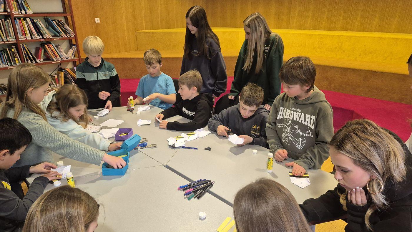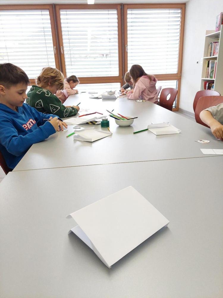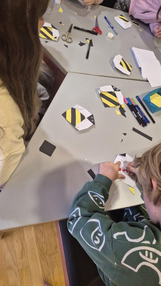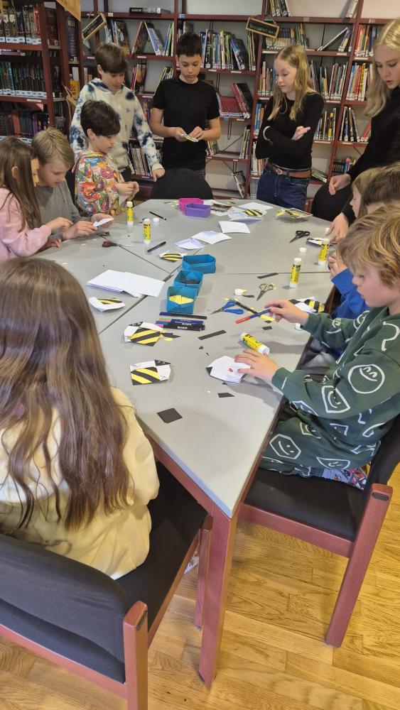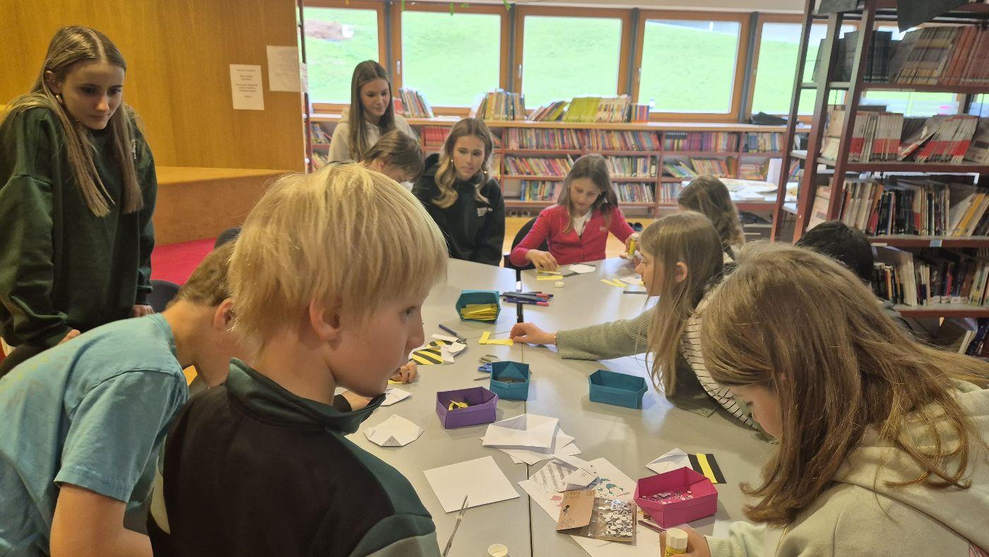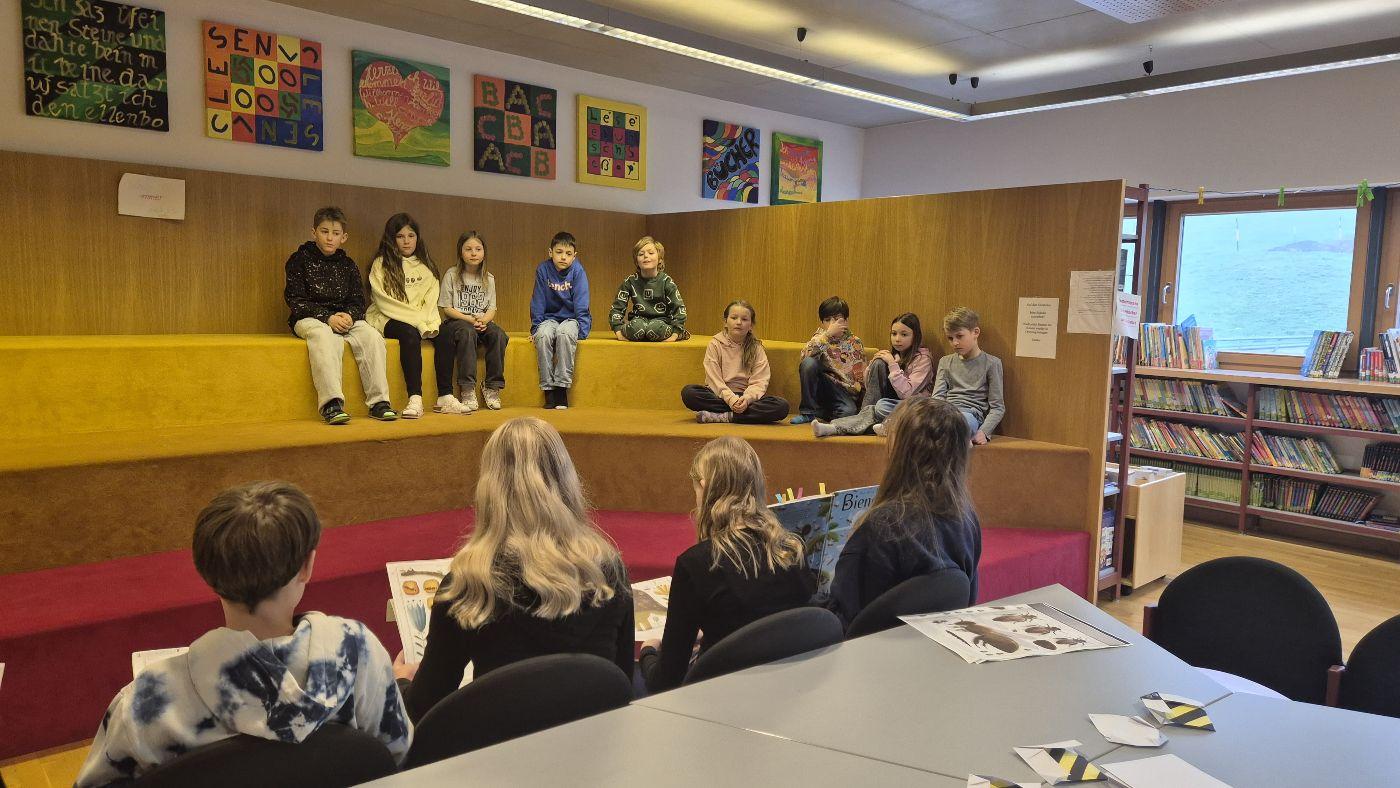 In der Bibliothek haben Schülerinnen und Schüler aus der 3. und 4. Klasse aus dem Sachbuch "Bienen" von Piotr Socha vorgelesen und die dazugehörigen Bilder betrachtet. Anschließend wurde aus Papier eine Origami-Biene gefaltet. Die Station wurde von Frau Bürger vorbereitet und geleitet.