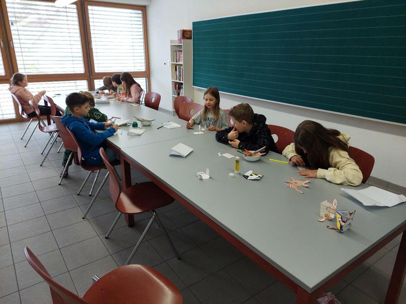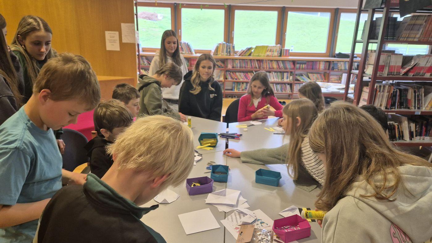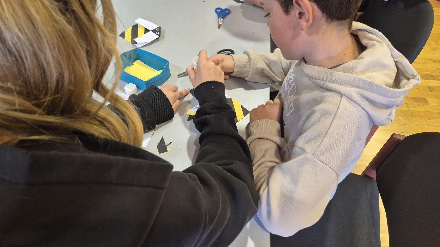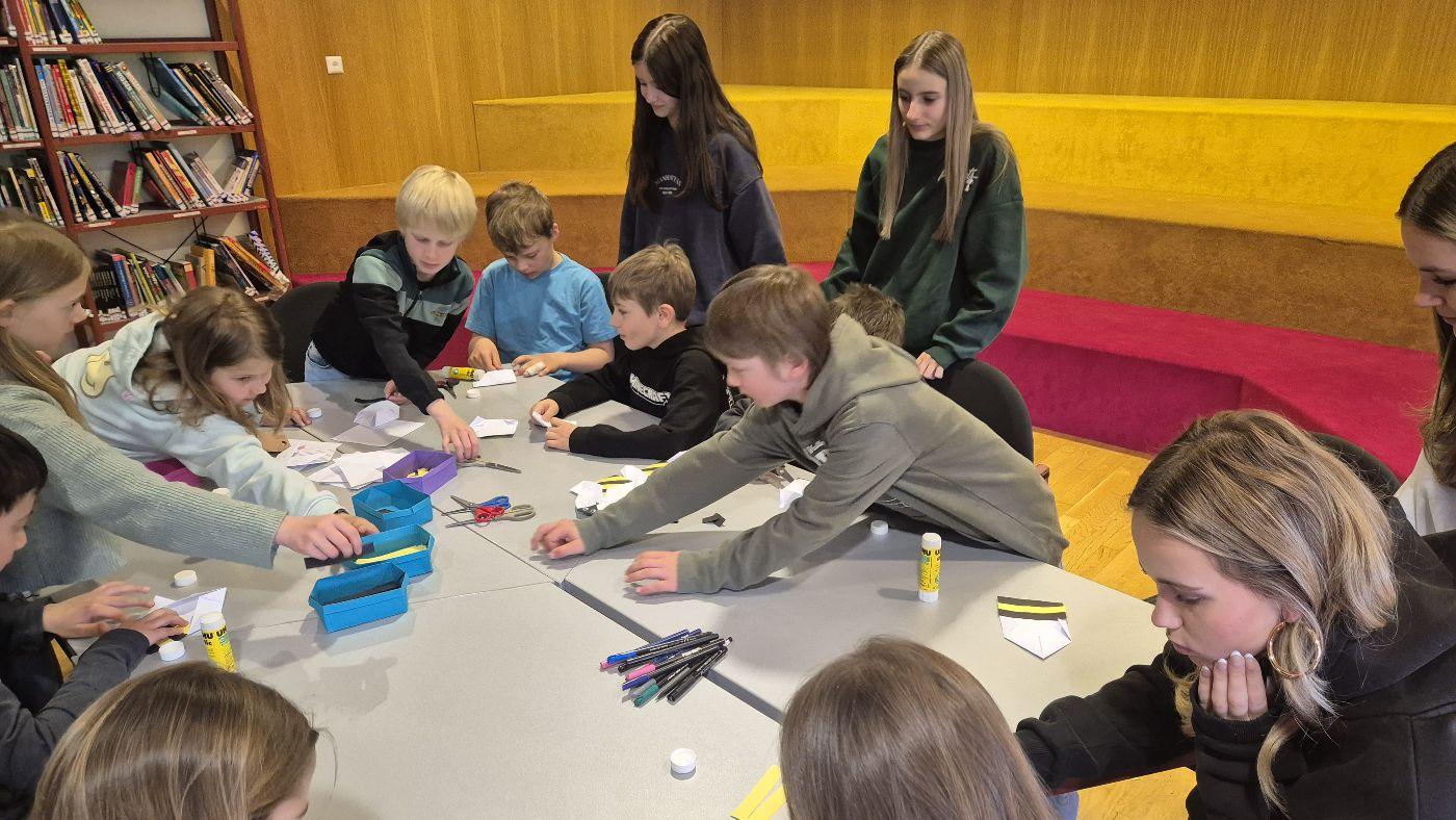 In der Bibliothek haben Schülerinnen und Schüler aus der 3. und 4. Klasse aus dem Sachbuch "Bienen" von Piotr Socha vorgelesen und die dazugehörigen Bilder betrachtet. Anschließend wurde aus Papier eine Origami-Biene gefaltet. Die Station wurde von Frau Bürger vorbereitet und geleitet.